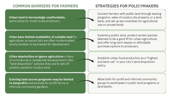 Below are some common land access challenges for urban farmers, along with policy strategies for policymakers to better connect farmers to urban farm spaces.